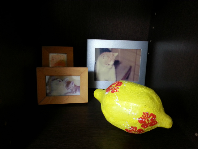 部屋の中に、思い出コーナーを作り、そこにコンパクトに飾ってみます。